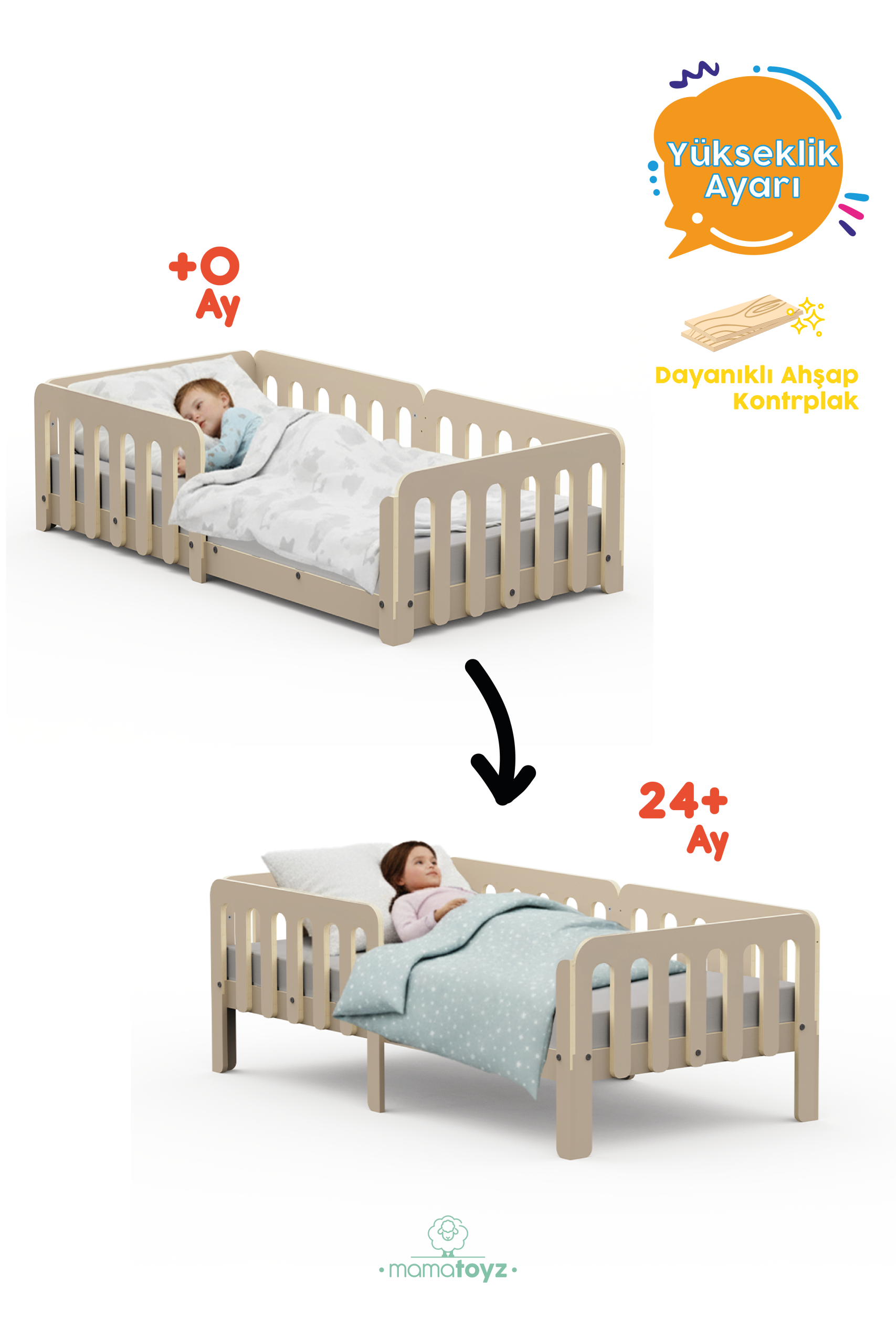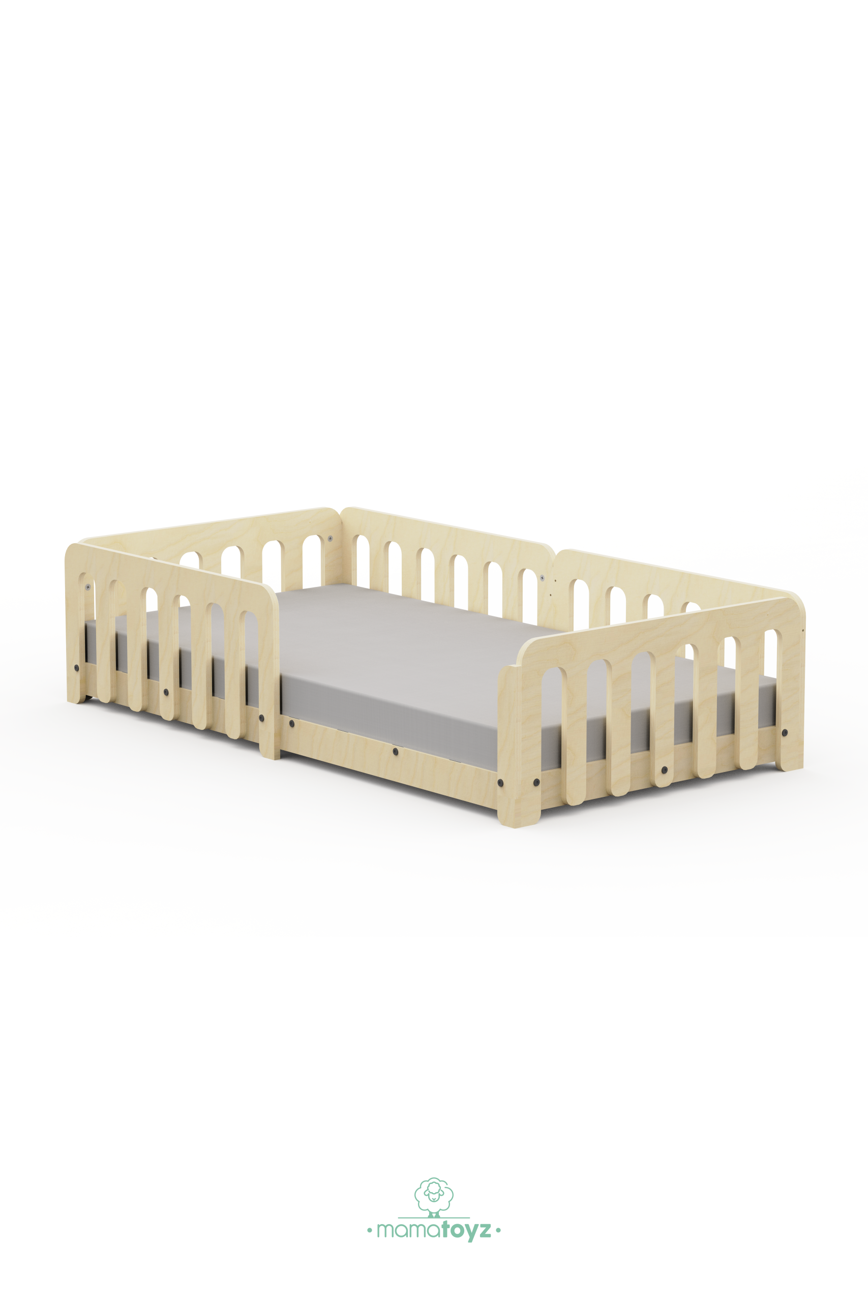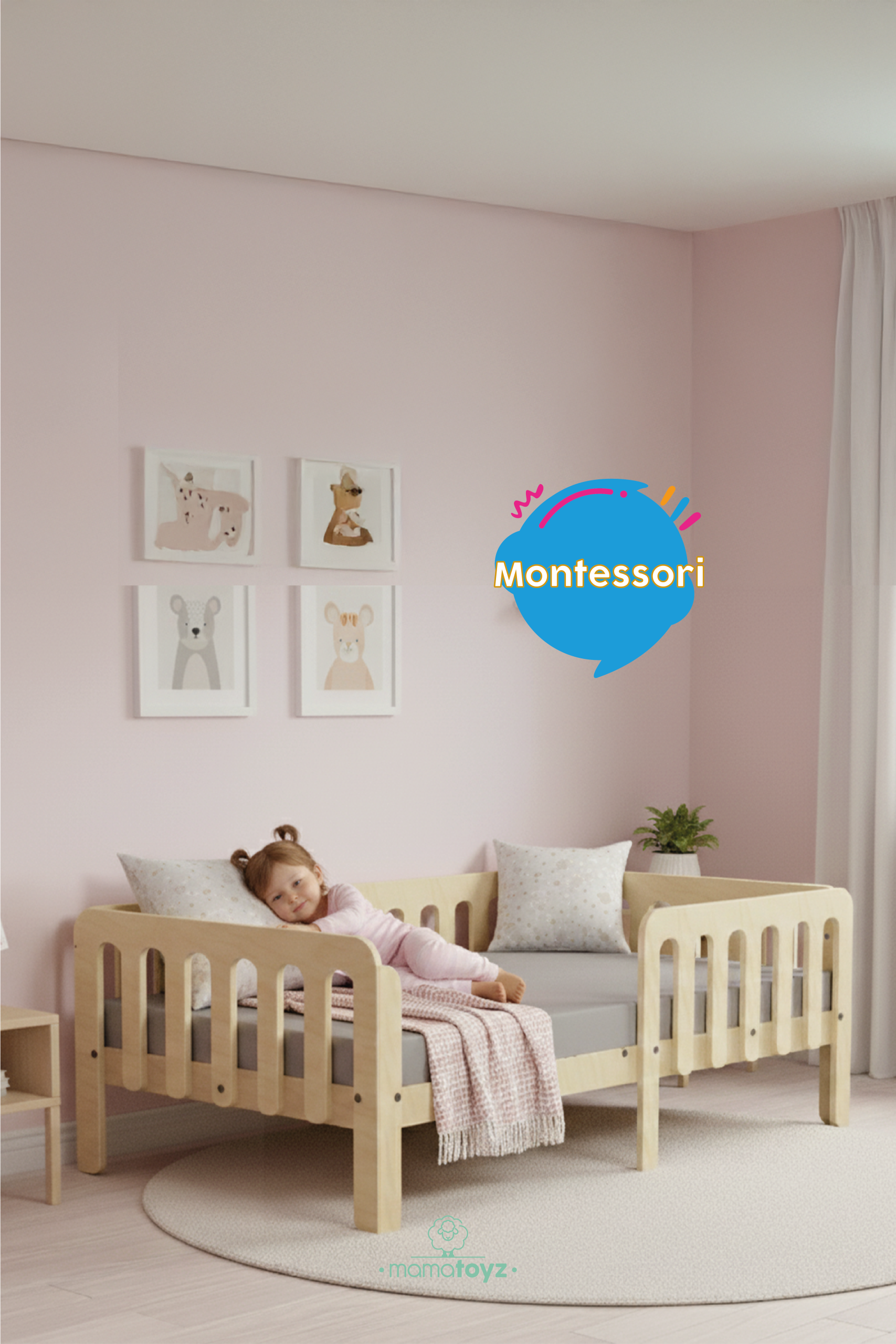 Inspired by the Montessori approach, this low-tothe-ground bed encourages independence and self-confidence by allowing children to get in and out on their own. Its open design reduces the risk of falls, supports better sleep, and promotes freedom of movement. A simple, functional, and developmentfriendly space that offers both comfort and safety